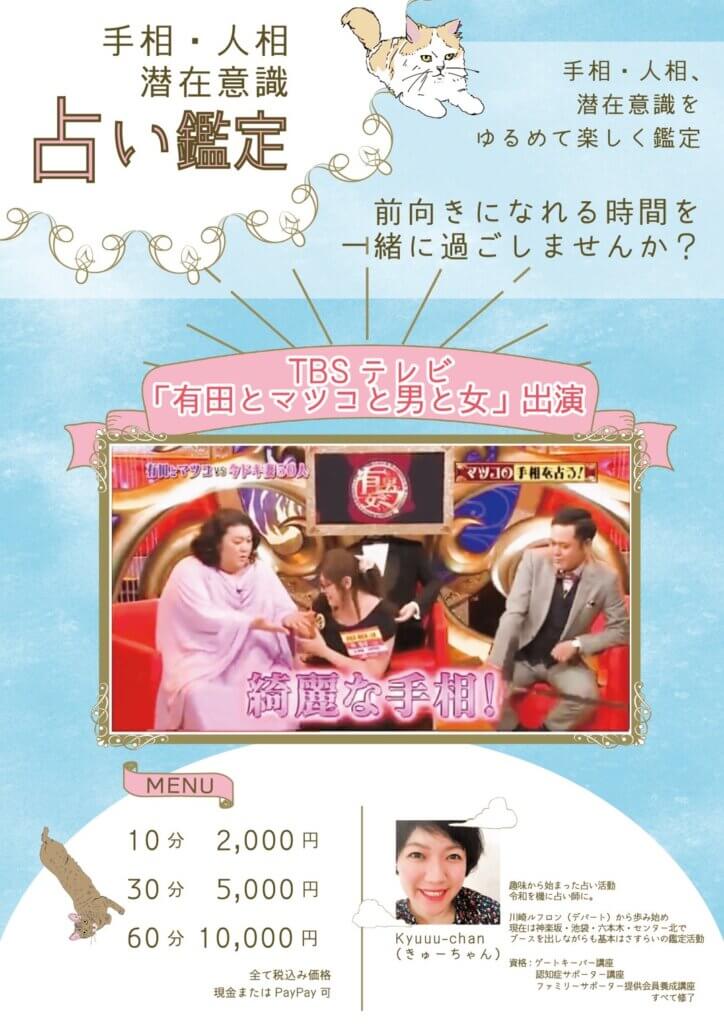 川崎ルフロン(デパート)から歩み始め、現在は神楽坂・池袋・六本木・センター北でブースを出しながらも基本はさすらいの鑑定活動しています。
